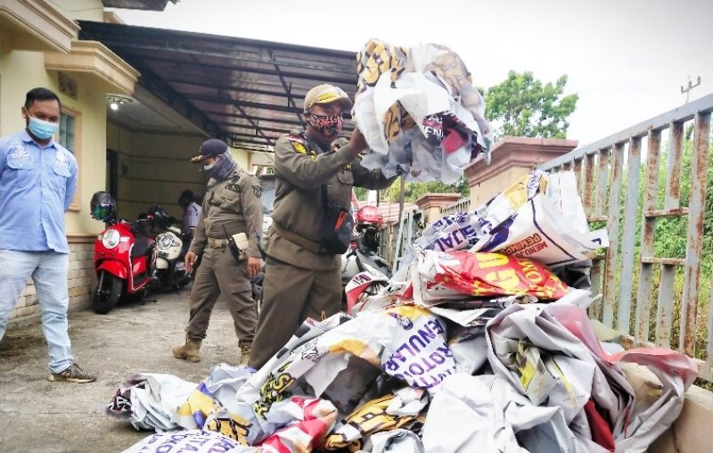 Satpol PP Bartim mengumpulkan APK hasil penertiban di halaman samping Bawaslu Bartim di Tamiang Layang, Rabu (14/10/2020). (ANT)