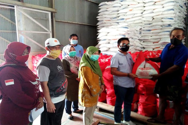 Plt Kadis Sos PMD Barito Utara Eveready Noor didampingi Kasi Pendampingan dan Pemberdayaan Bidang Penanganan Fakir Miskin, pada Dinas Sosial Provinsi Kalteng Ema Hermawati, Kepala Bulog, Lurah Lanjas menyerahkan bantuan secara simbolis kepada warga di Muara Teweh, Jumat (16/10/2020). (ANT/IST)