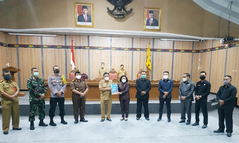 Asisten Bidang Pemerintahan dan Kesejahteraan Rakyat Sekretariat Daerah Kotawaringin Timur, Nur Aswan menyerahkan draf Raperda APBD 2021 kepada Ketua DPRD, Rinie saat rapat paripurna DPRD Senin (16/11/2020). (ANT)