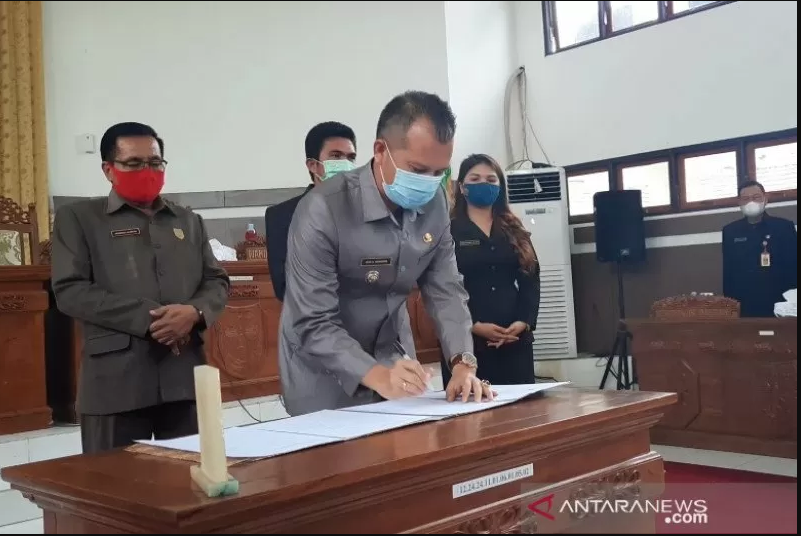 MASAPNEWS,- Bupati Gunung Mas, Kalimantan Tengah Jaya S Monong bersama unsur pimpinan DPRD setempat menandatangani persetujuan bersama terhadap Rancangan Peraturan Daerah Kabupaten Gumas tentang APBD 2021 saat rapat paripurna di Kuala Kurun, Senin.
