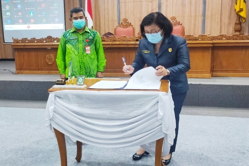 Ketua DPRD Kotawaringin Timur Rinie dan Asisten Administrasi Umum Sekretariat Daerah Kotawaringin Timur, Imam Subekti saat penandatanganan nota kesepakatan terkait RAPBD Kotawaringin Timur tahun 2021, Kamis (26/11/2020). (ANT/IST)