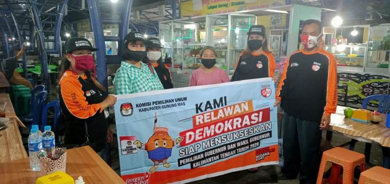 MASAPNEWS – Relawan Demokrasi (Relasi) melakukan sosialisasi terkait pelaksanaan Pemilihan Kepala Daerah Kalimantan Tengah 2020 kepada masyarakat yang berkunjung ke Taman Kota Kuala Kurun, Kecamatan Kurun, Kabupaten Gunung Mas (Gumas), Kamis malam (26/11/2020).