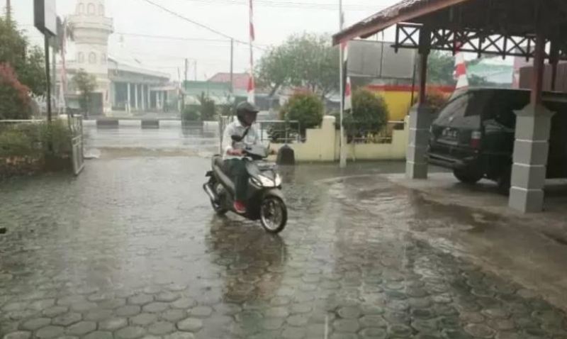 Ilustrasi - Salah satu warga berkendara saat hujan mengguyur wilayah Kota Palangka Raya, Rabu (14/8/2019). (ANT)
