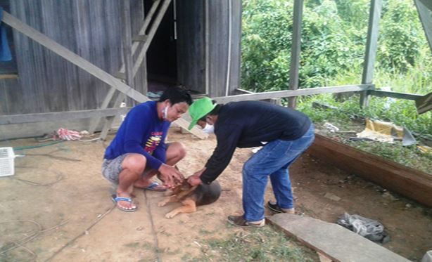 Pegawai Distan Gumas melakukan vaksinasi rabies kepada anjing milik warga Desa Kasintu pada tahun 2020 lalu. (Foto : Distan Gumas)