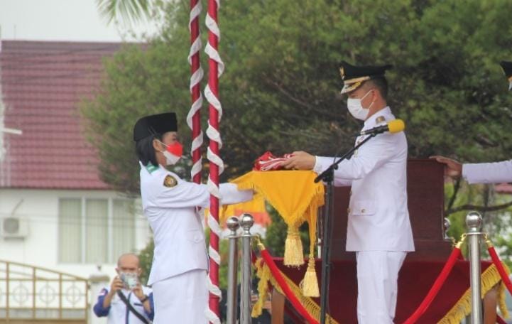 Bupati Gumas, Jaya S Monong menyerahkan Sang Saka Merah Putih kepada anggota Paskibraka untuk dikibarkan.