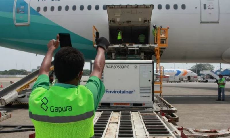 Petugas Bandara Soekarno-Hatta Tangerang, Banten, mengeluarkan kontainer berisi vaksin COVID-19 dari bagasi pesawat, Kamis 19/8/2021). (ANT/IST)