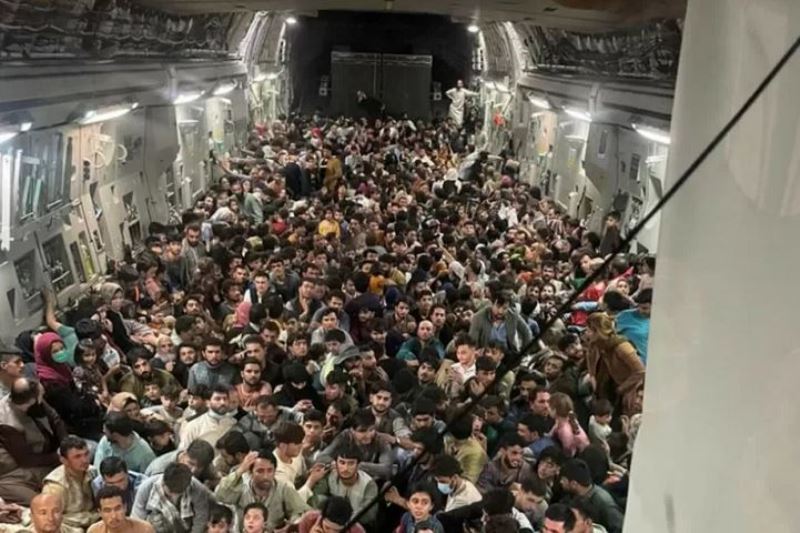 Sebuah foto yang memperlihatkan warga sipil Afghanistan –beberapa membawa koper, lainnya memegang botol susu bayi– di dalam pesawat kargo C-17 menjadi viral di media sosial.