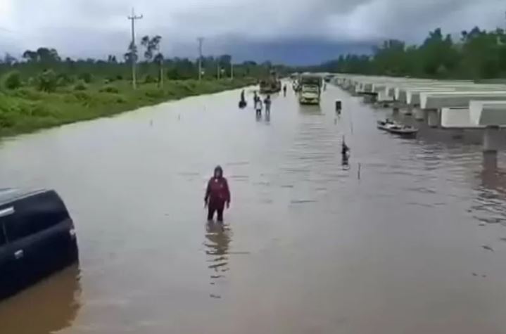 “Saya sarankan jangan memaksakan diri para pengendara untuk melintas, karena sudah banyak mobil dan truk yang terjebak di kawasan banjir tersebut,” bebernya.