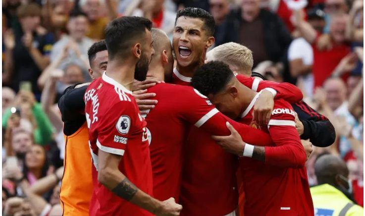 Pemain Manchester United merayakan gol kedua Cristiano Ronaldo saat melawan Newcastle United dalam laga Liga Inggris di Old Trafford, Manchester, Inggris, Sabtu (11/9/2021). Ronaldo mencetak dua gol dan MU menang 4-1. ANT/IST
