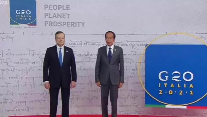 Sejumlah kepala negara tampak sudah hadir di La Nuvola Roma. Sebelum Presiden Jokowi, tampak Sultan Brunei Darussalam Sultan Hassanal Bolkiah dan sesudah Presiden Jokowi, tampak Presiden Prancis Emmanuel Macron dan Kanselir Jerman Angela Markel.