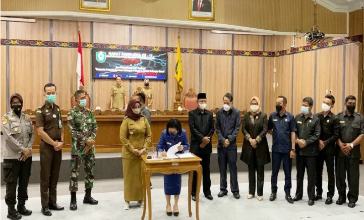 Ketua DPRD Kotawaringin Timur Rinie bersama Wakil Ketua DPRD Rudianur dan Wakil Bupati Irawati bergantian menandatangani berita acara persetujuan Raperda Penyelenggaraan Cadangan Pangan, Senin (11/10/2021). ANT/IST