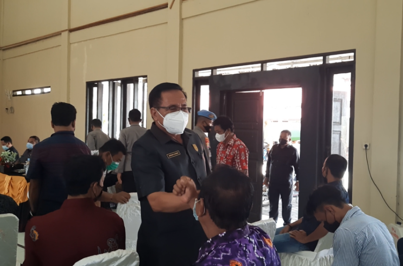 Ketua DPRD Kabupaten Gumas, Akerman Sahidar menyapa para calon kades usai calon kades melakukan deklarasi damai, di Kuala Kurun, Selasa (9/11/2021). (MASAPNEWS/GCM)