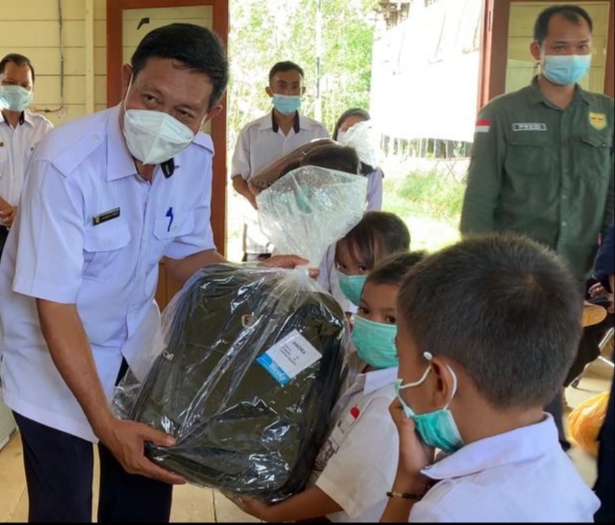 Kadis Sosial Gumas Jhonson Ahmad saat menyerahkan bansos kepada anak sekolah SD di Kelurahan Tumbang Marikoi Kecamatan Damang Batu, Rabu (17/11/2021) kemarin. (IST)
