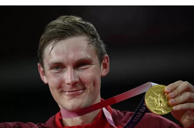 Pebulu tangkis Denmark Viktor Axelsen memegang medali emas tunggal putra Olimpiade Tokyo 2020 di Musashino Forest Sports Plaza, Tokyo, pada 2 Agustus 2021. (ANT/AFP/ALEXANDER NEMENOV)