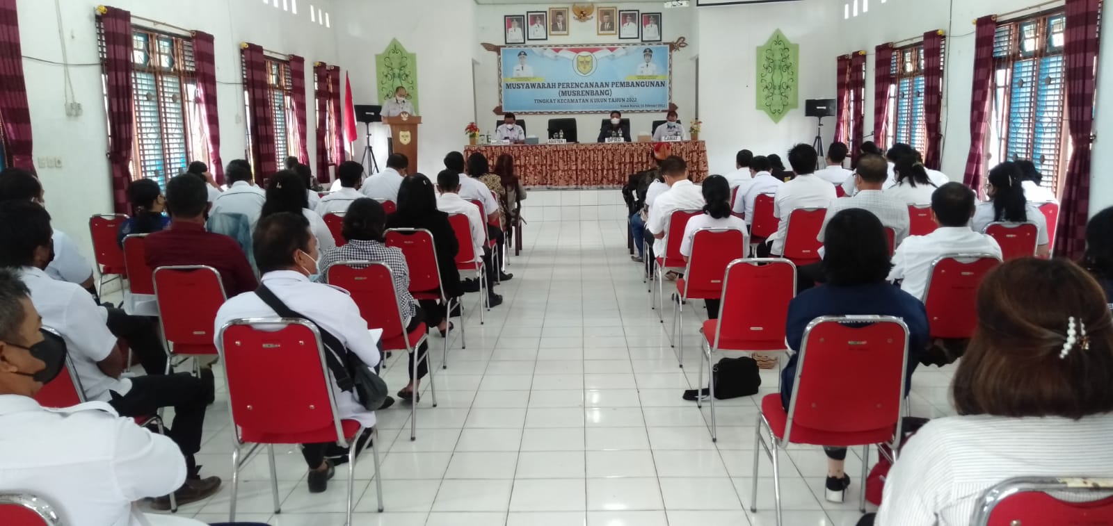 Peserta Musrenbang Kecamatan Kurun, saat mendengarkan sambutan Bupati yang disampaikan Asisten I Setda Gumas Lurand, Rabu (16/2/2022).
