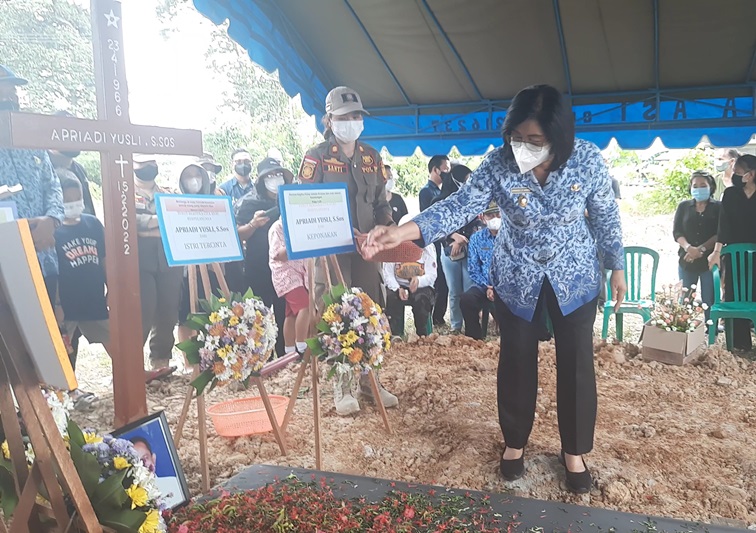 Wabup Efrensia L.P Umbing menabur bunga di makam almarhum Kasubbag Umum dan Kepegawaian Satpol PP Gumas Apriadi Yusli, di Tempat Pemakaman Umum Jalan Adonis Samad Kuala Kurun, Kamis (17/2/2022). (MASAPNEWS/GCM)
