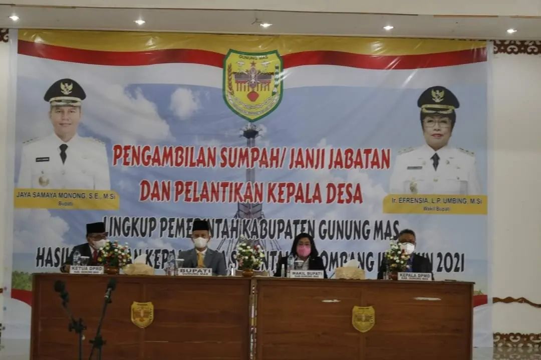 (Dari kiri) Ketua DPRD Kabupaten Gumas Akerman Sahidar, Bupati Jaya S Monong, Wakil Bupati Efrensia L.P Umbing, dan Kepala DPMD Yulius saat pelantikan 14 kades terpilih hasil Pilkades Serentak Gelombang III tahun 2021, di GPU Damang Batu Kuala Kurun, Kamis (10/3/2022). (Foto : Protokol dan Perjalanan Setda Gumas)