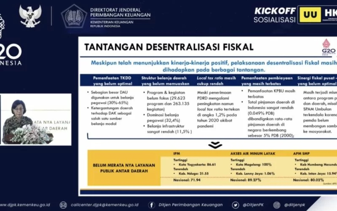 “Meski 20 tahun sudah mencapai berbagai capaian (pada desentralisasi fiskal) namun kita mengakui masih banyak tugas yang harus diselesaikan dan diperbaiki,” kata Menkeu Sri Mulyani dalam kick off Sosialisasi UU HKPD di Jakarta, Kamis.