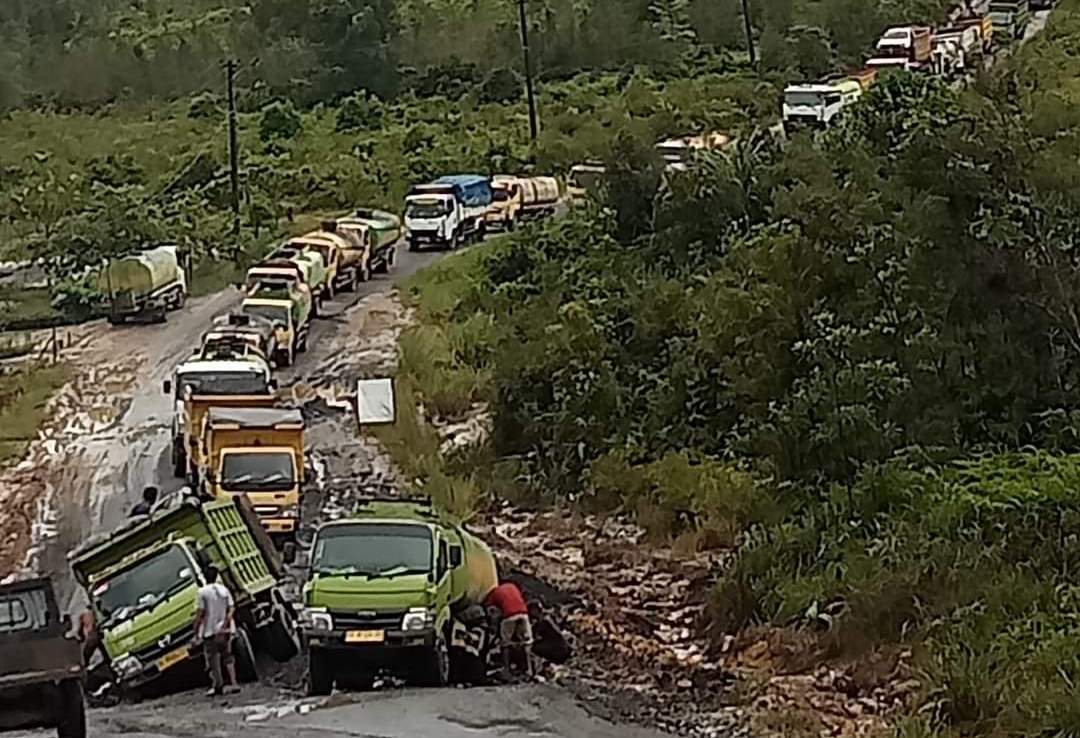 Truk amblas sebabkan kemacetan di ruas jalan Palangka Raya-Kuala Kurun tepatnya di sekitar wilayah Penda Linda Kecamatan Kurun, Senin (25/4/2022). (IST)