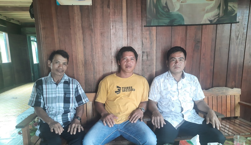 Kades Tumbang Ponyoi Melky Sudiarjo (tengah) didampingi Mantir Adat Diun H Uan (kiri) dan Tokoh Pemuda Desa Tumbang Korik Dewik berfoto bersama usai dibincangi awak media di Kuala Kurun, Jumat (29/4/2022). (MASAPNEWS/GCM)