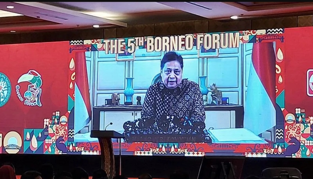 Menteri Koordinator Bidang Perekonomian Airlangga Hartarto memberikan sambutan secara virtual dalam acara Borneo Forum ke-5 di Palangka Raya, Kalimantan Tengah, Rabu (24/8/2022). (MASAPNEWS/ANT)
