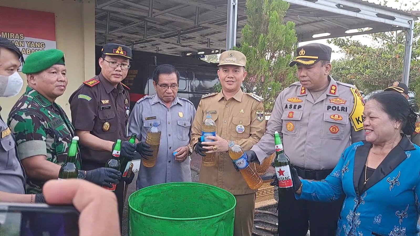 MASAPNEWS – Bupati Gunung Mas, Jaya S Monong, bersama forum koordinasi pimpinan daerah (forkopimda) dan lainnya, ikut memusnahkan puluhan botol minuman beralkohol (minol), yang dilakukan oleh Polres setempat di Kuala Kurun, Senin (17/4/2023).