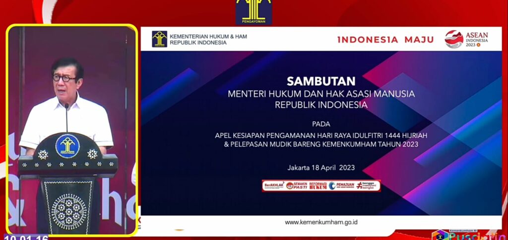 Menteri Hukum dan HAM melalui sambutannya menyampaikan pesan kepada seluruh jajarannya untuk tetap melaksanakan tugas sesuai tanggung jawab, sehingga keamanan dan ketertiban tetap terjaga terutama pada Hari Raya Idul Fitri.
