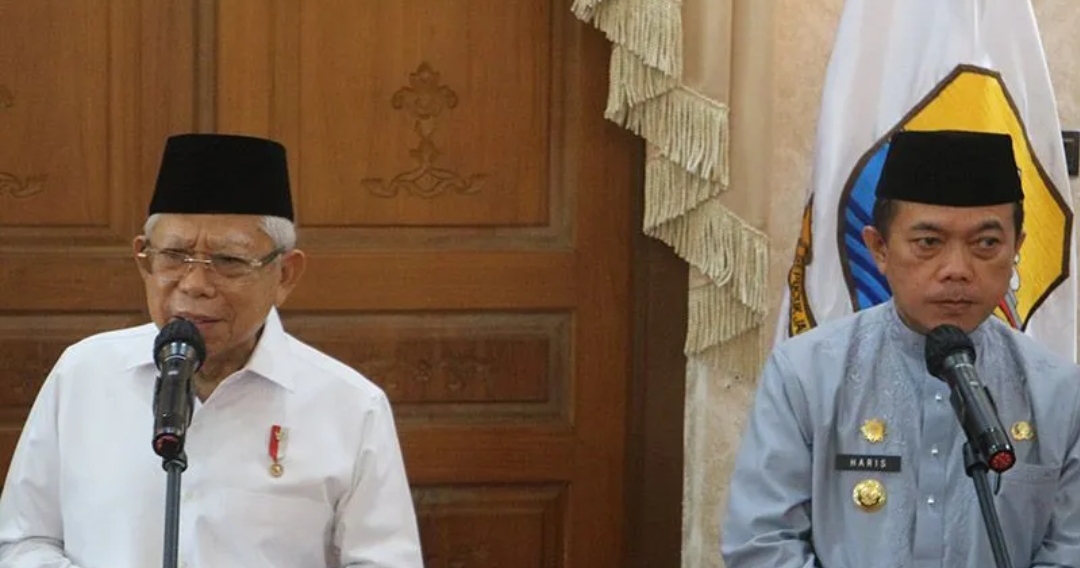 Wakil Presiden Maruf Amin didampingi Gubernur Jambi Al Haris menyampaikan pernyataan setelah menyaksikan pengukuhan Komite Daerah Ekonomi dan Keuangan Syariah (KDEKS) provinsi Jambi di Rumah Dinas Gubernur Jambi, Kamis (4/5/2023). (MASAPNEWS/ANT)