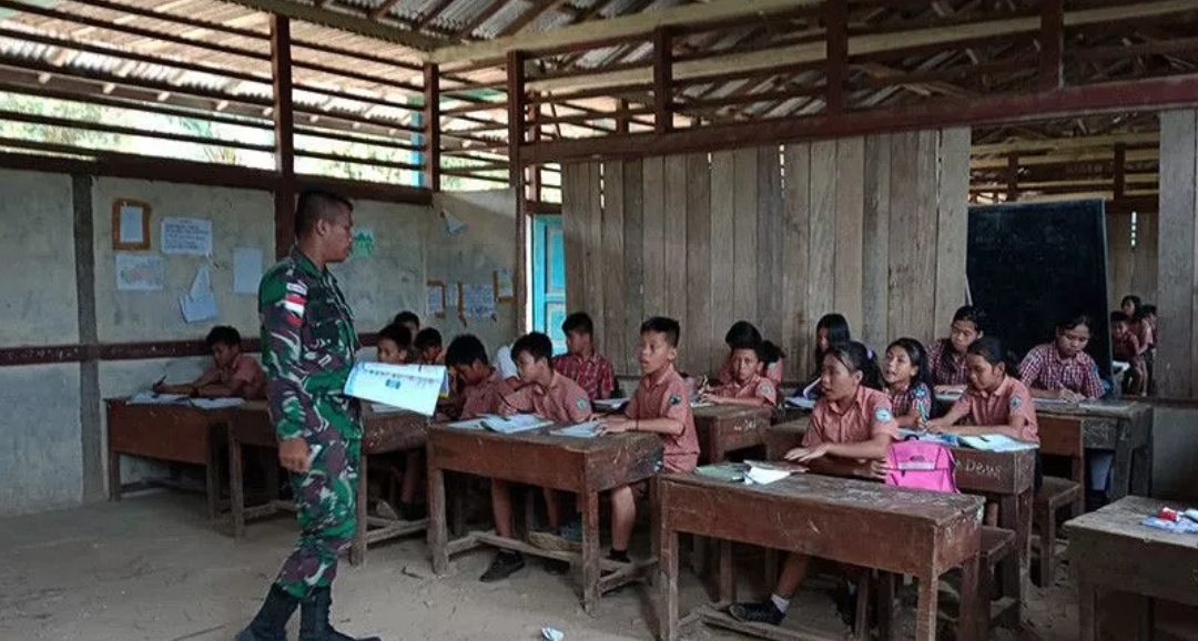 Arsip foto - Prajurit TNI Satgas Pamtas Yonarmed 19/105 Trk Bogani menjadi tenaga pendidik bantu di SDN 08 Muakan Petinggi Kecamatan Ketungau Hulu, wilayah Kabupaten Sintang Kalimantan Barat, Senin (23/1/2023). (MASAPNEWS/ANT/HO-Penerangan Yonarmed 19/105 Trk Bogani)